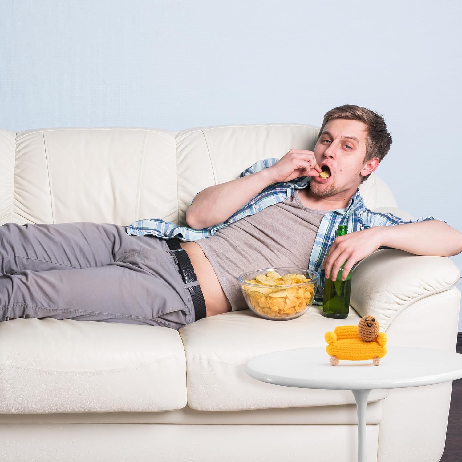 - Couch Potato Design: These mini crochet dolls are designed as a funny couch potato. You'll crack a laugh when you see a "couch potato" slouching on the couch.